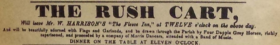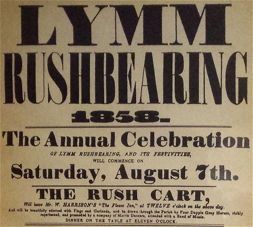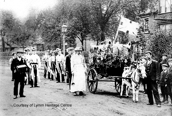 The Rushcart with The Lymm Morris in Maltmans Road, Lymm Pulled by a donkey - in 1858 it had been drawn by "Four Dapple Grey Horses"