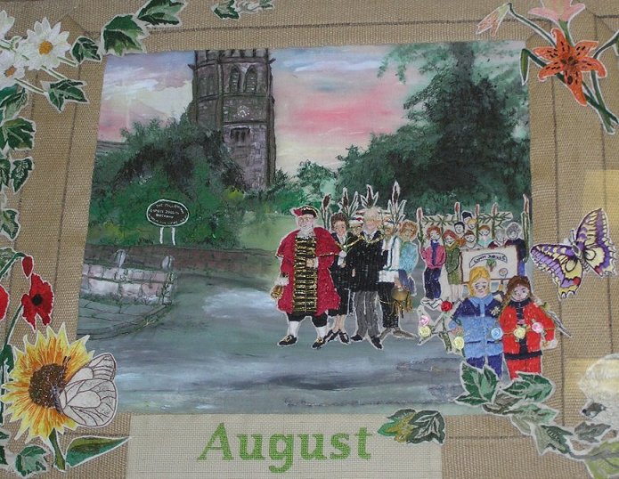 An extract (August) of a Lymm through the year embroidery at the Village Hall
