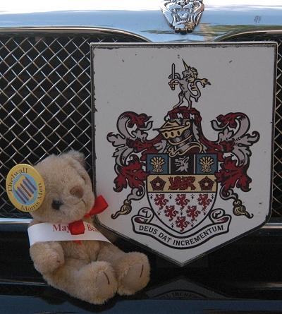 The bear usually rides inside the Mayors Limo, but posed by the Warrington Coat of arms on the radiator grill