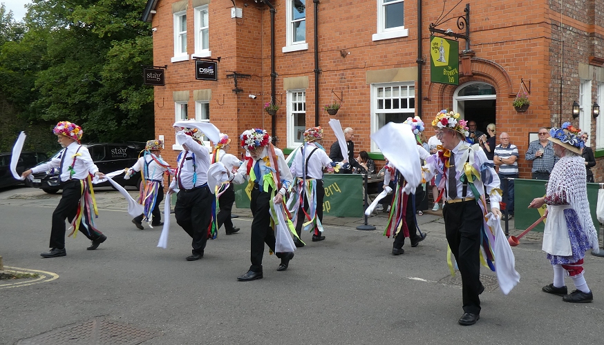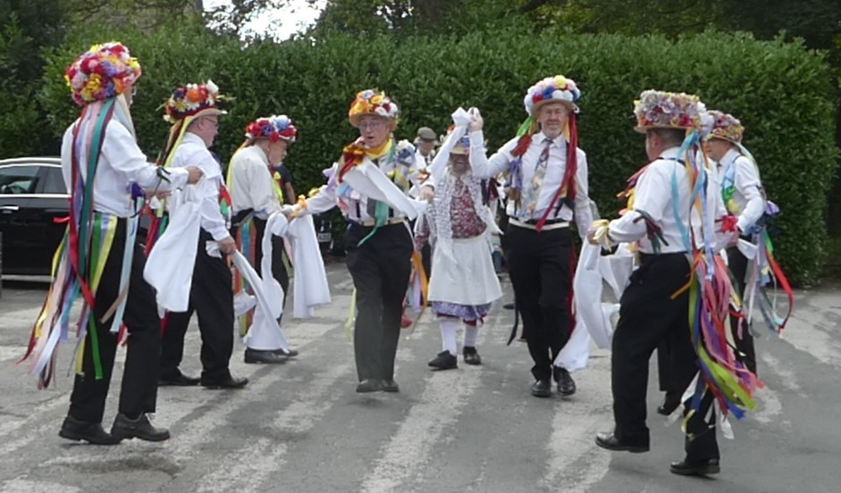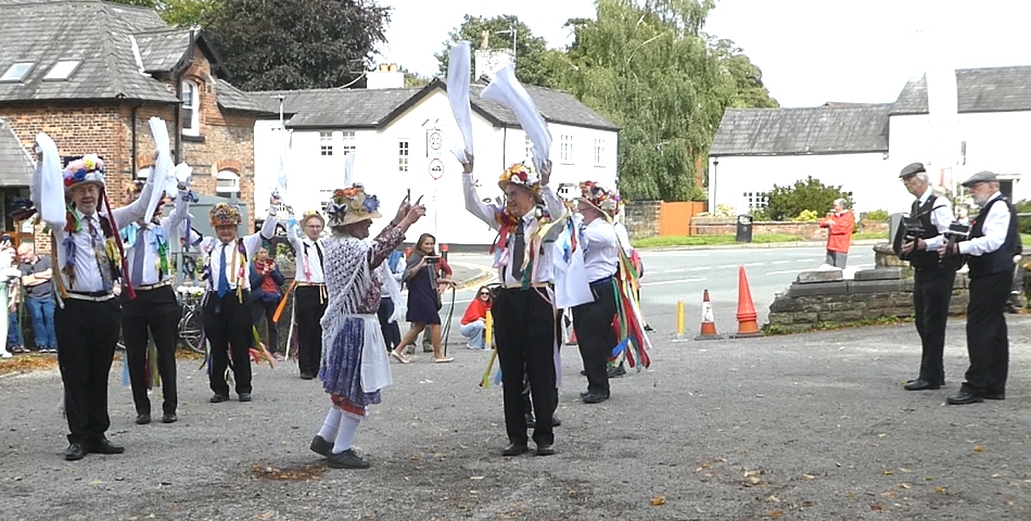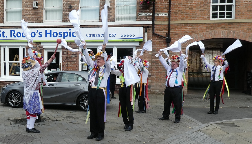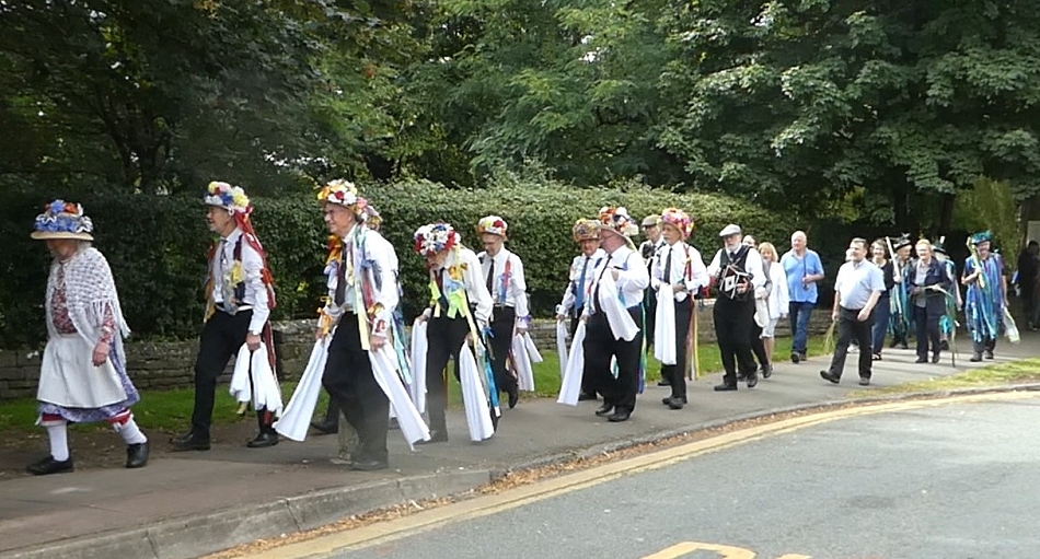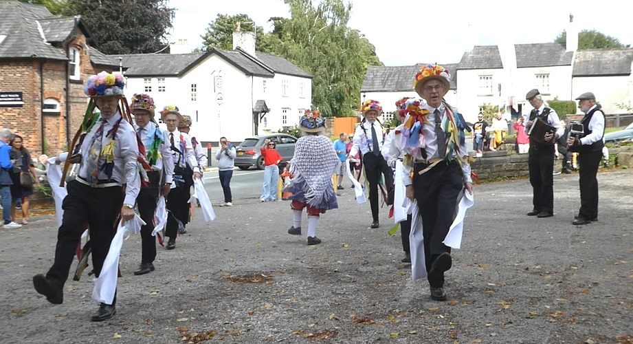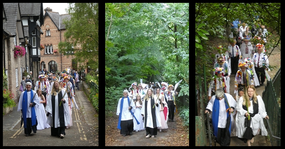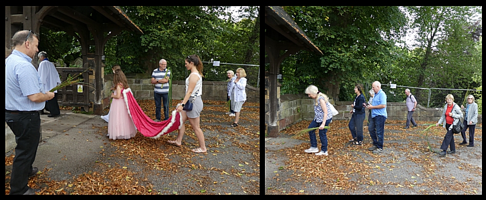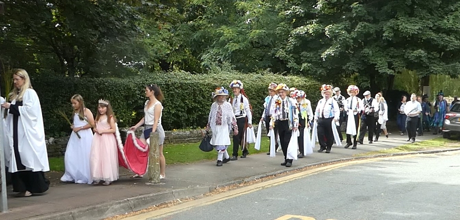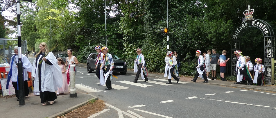 Vicar, Lymm May Queen, Rose Queen + train carrier followed by Lymm Morris