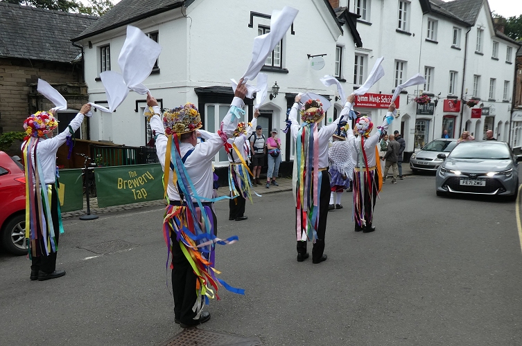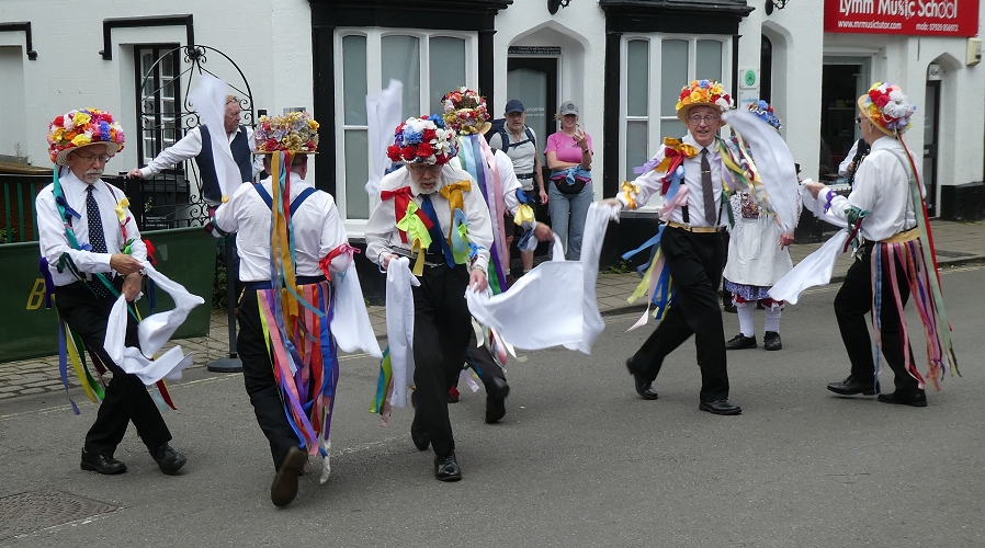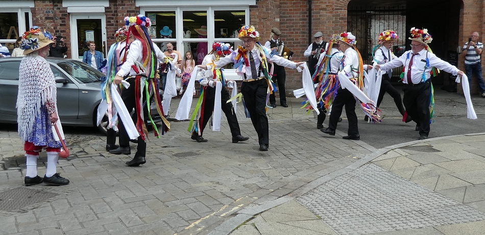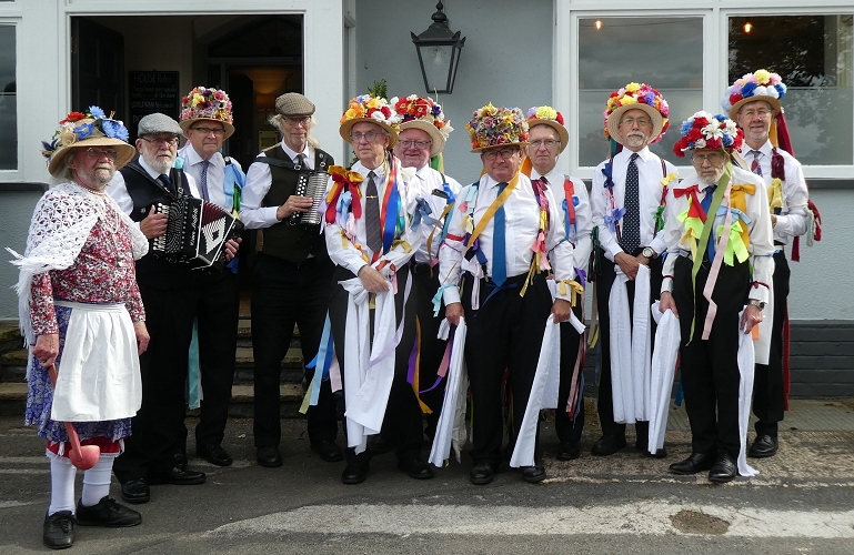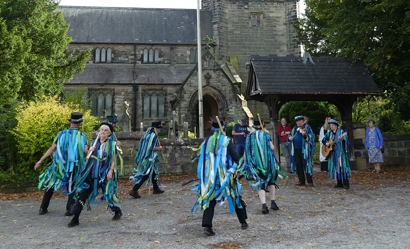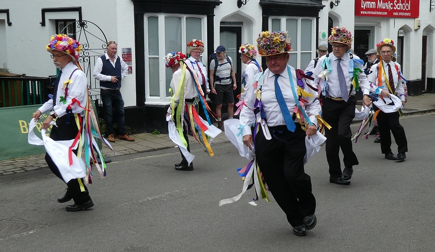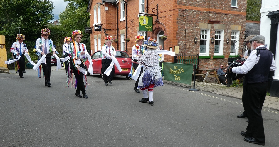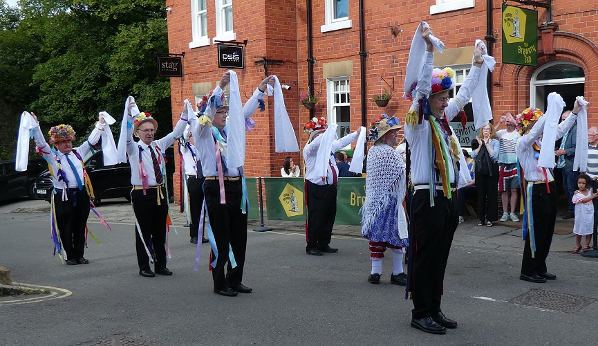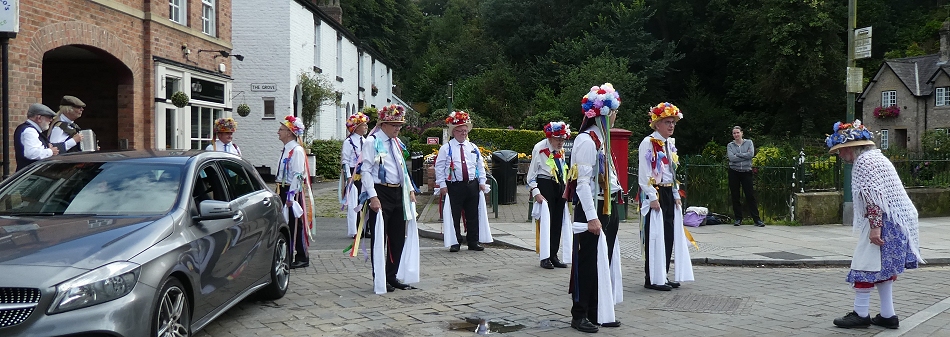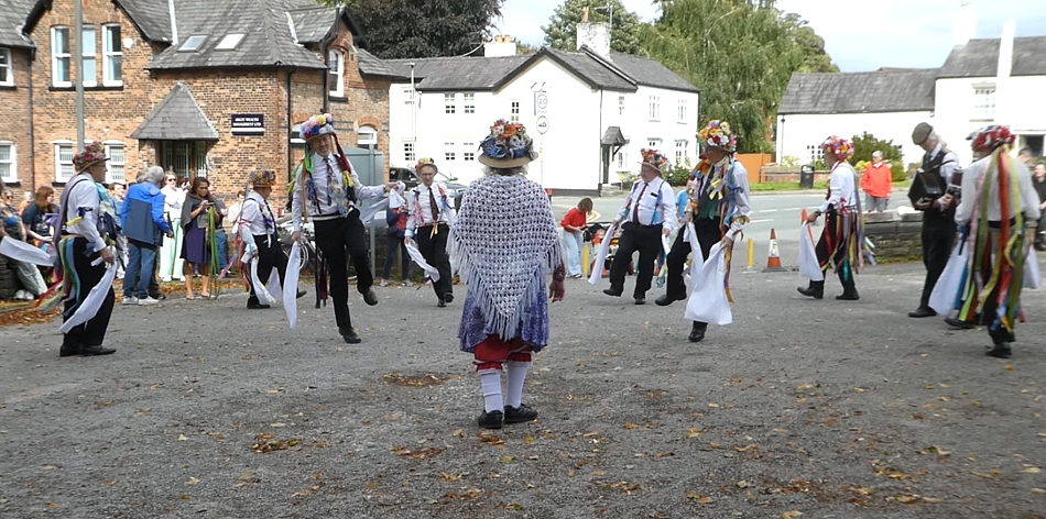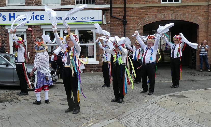 Vicar, Lymm May Queen, Rose Queen + train carrier followed by Lymm Morris