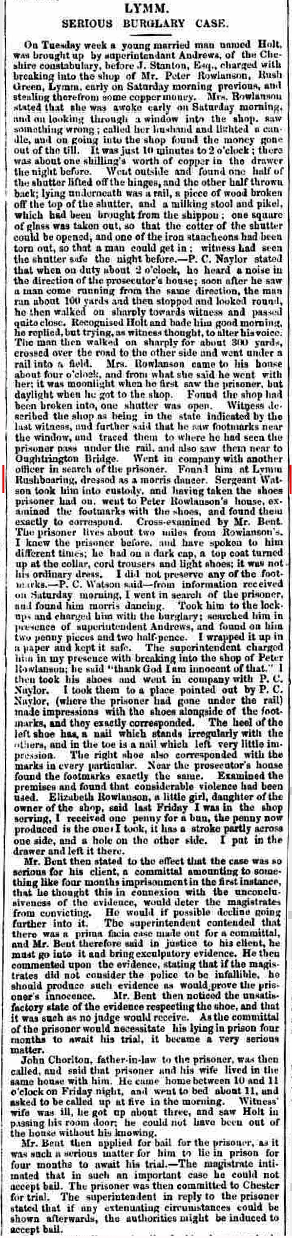 On Tuesday week a young married man named [James] Holt was brought up... ...charged with breaking into the shop of Mr Peter Rowlinson on Rushgreen, Lymm, early on Saturday morning previous and stealing therefrom some copper money. .... more descriptive text ... Found him [the suspect] at Lymm Rushbearing dressed as a morris dancer. |