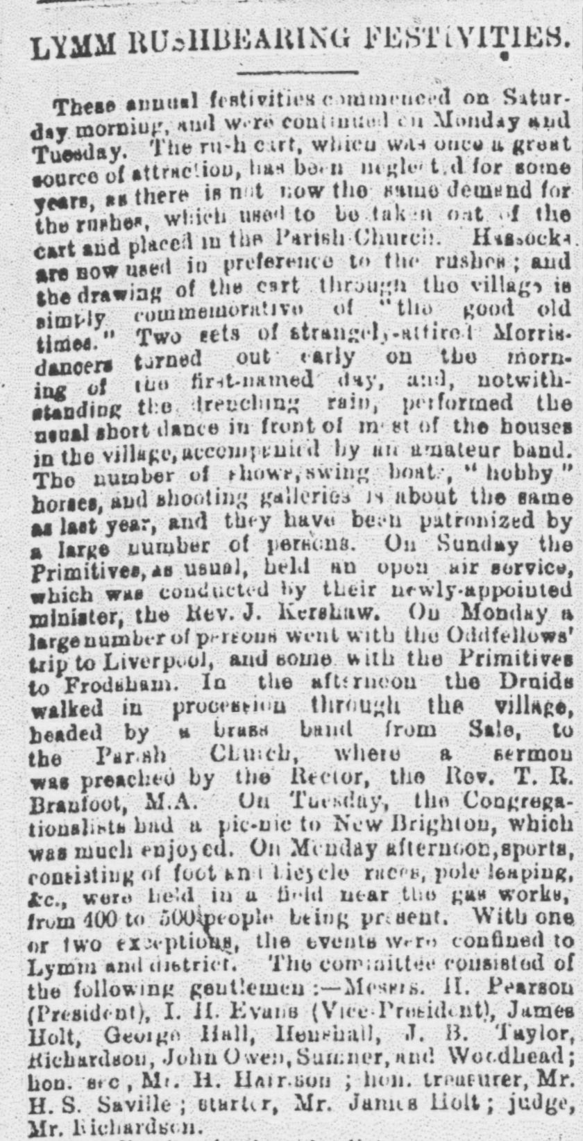 Two sets of strangely-attired Morris dancers turned out early on the morning of the first named day, and, not withstanding the drenching rain, performed the usual short dance in front of most of the houses in the village , accompanied by an amateur band. * Hassock: Clump of grass? |