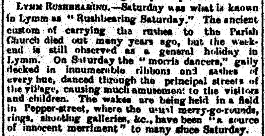 The ancient custom of carrying the rushes to the Parish Church died out many years ago, but the weekend is still observed as a general holiday in Lymm |