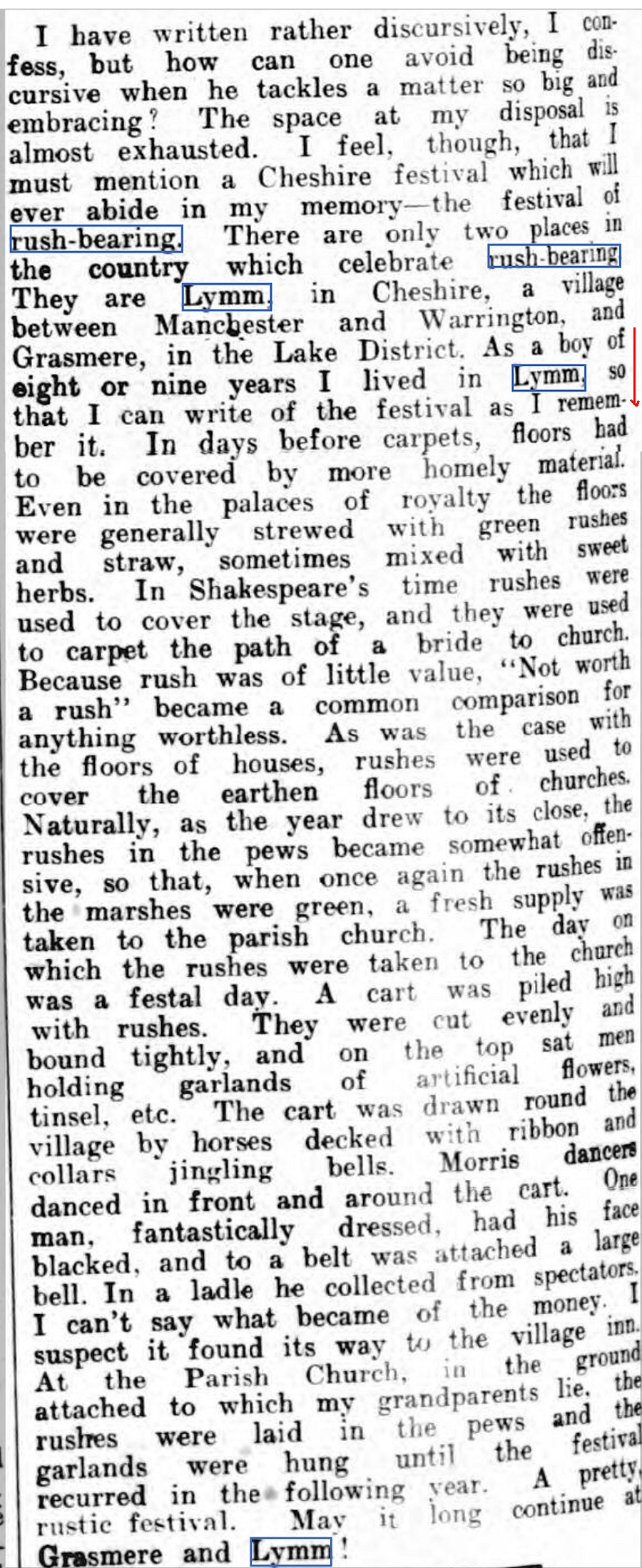 ...I must mention a Cheshire festival which will ever abide in my memory -- The festival of rush-bearing... ...The day on which the rushes were taken to the church