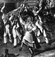 Postcard of a 19C painting of Lymm Rushbearing (showing morris dancers). Correspondence about the painting has been included. |